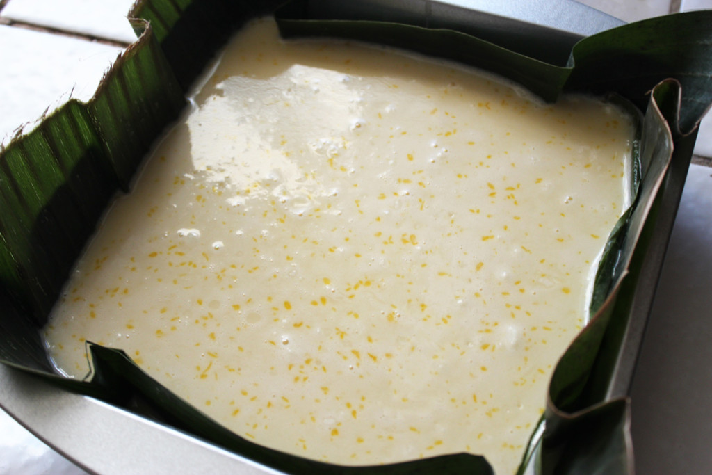 - Cool cake completely (at least one hour) before removing banana leaf and cutting cake to a desired size.